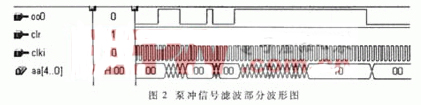 由波形可知,oo0為高,計數(shù)器開始計數(shù)。對于小的脈沖,計數(shù)器的最高位即aa4為低,認為是干擾信號;只有當aa4為1時才認為oo0的脈沖信號有效,并通過aa4將時鐘脈沖阻斷,使計數(shù)器值不再增加。這樣做是為了防止由于oo0的脈沖不定寬,使aa4的電平不定,后面無法進行處理。還應(yīng)注意的是,把oo0引入了清零信號。當信號有較多毛刺時,若oo0為低時不清零則使計數(shù)器不斷累加,積累到一定程度,使aa4為1,系統(tǒng)將認為有一有效脈沖信號,產(chǎn)生誤動作。