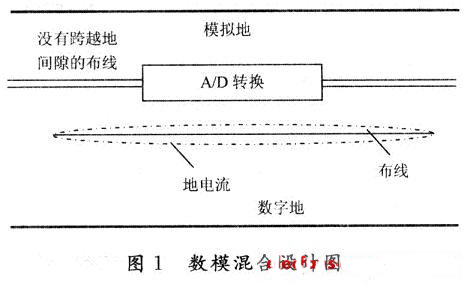系統(tǒng)僅有一個(gè)A/D轉(zhuǎn)換器,采用混合信號PCB的分區(qū)設(shè)計(jì),即使用同一地,如圖1所示。將PCB分區(qū)為模擬部分和數(shù)字部分,在A/D器件的下面把模擬地和數(shù)字地部分連接在一起。保證兩個(gè)地之間的連接橋?qū)挾扰cIC等寬,所有信號線一般都不能跨越分割間隙,跨越分割間隙的信號線要位于緊鄰大面積地的布線層上。電路板的所有層中數(shù)字信號只能在電路板的數(shù)字部分布線,模擬信號只能在電路板的模擬部分布線,模擬和數(shù)字電源分開。