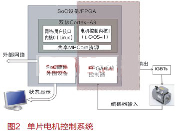 隨著ARM Cortex-A9多處理器和FPGA SoC的推出,可把現(xiàn)有的分立微控制器和數(shù)字邏輯功能集成到一個(gè)多核器件中。這減小了功耗和體積,而主要難點(diǎn)之一是在一個(gè)器件中同時(shí)實(shí)現(xiàn)安全關(guān)鍵和非安全關(guān)鍵軟件單元。圖1顯示了使用三個(gè)分立器件實(shí)現(xiàn)的一個(gè)典型電機(jī)控制系統(tǒng)。系統(tǒng)有一個(gè)非安全網(wǎng)絡(luò)/用戶(hù)接口處理器,一個(gè)電機(jī)控制監(jiān)控微控制器和一片用于實(shí)現(xiàn)硬核實(shí)時(shí)電機(jī)控制器的FPGA。圖1中的陰影部分含有設(shè)計(jì)的安全關(guān)鍵單元,需要通過(guò)外部權(quán)威機(jī)構(gòu)進(jìn)行安全認(rèn)證。
