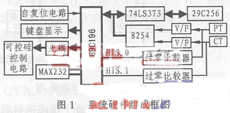 本電網(wǎng)無功功率補償控制系統(tǒng)的硬件組成框圖如圖1所示。它主要有單片機系統(tǒng)(由80196單片機、74LS373、FLASH MEMERY 29C256組成的自復位電路)、鍵盤顯示電路、輸入電路、輸出電路和通信接口電路MAX232等部分組成。