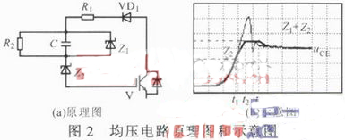 通過上述對串聯(lián)IGBT均壓階段特性的分析,綜合各階段均壓控制的特點,采用基于穩(wěn)壓管箝位的峰值控制方法實現(xiàn)IGBT串聯(lián)均壓,均壓電路如圖2a所示。該方法將串聯(lián)IGBT的關(guān)斷過程進行優(yōu)化,在T1階段,使uCE具有兩階段電壓變化率,如圖2b所示。第1階段電壓變化率較快,以降低損耗:第2階段電壓變化率下降,以降低電壓不均衡度,并為箝位電路贏得更多的響應(yīng)時間。通過調(diào)節(jié)轉(zhuǎn)折點和峰值箝位點的值,在IGBT關(guān)斷過程的損耗與電壓均衡度之間做出折中。在T2階段,由拖尾電流的差異引起不均壓,通過峰值箝位電路,向門極注入電流,改變uGE,使IGBT進入有源區(qū),進而控制uCE電壓,達到均壓控制。在關(guān)斷穩(wěn)態(tài)時,均壓支路還起到均壓電阻的作用。
