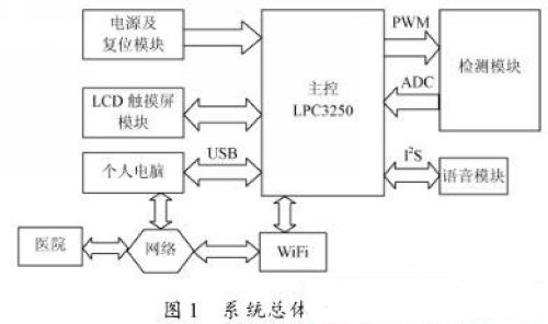 該多功能電子血壓計(jì)系統(tǒng)的總體結(jié)構(gòu)框圖如圖1所示,主要包括LPC3250主控模塊、電源及復(fù)位模塊、檢測(cè)模塊、LCD觸摸屏模塊、WiFi模塊、語(yǔ)音模塊和USB模塊等6大模塊。