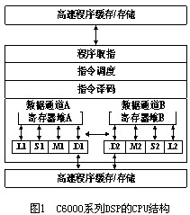 DSP的CPU結構如圖1所示,它具有兩個通道,每個通道具有4個功能單元(1個乘法器和3個算術邏輯單元),16個32位通用寄存器,每個通道的功能單元可以隨意訪問本通道的寄存器。CPU還有兩個交叉單元,通過它們,一個通道的功能單元可以訪問另一個通道的寄存器。另外, CPU還具有256 bit寬的數(shù)據(jù)和程序通道,可以使程序存儲器在每個時鐘周期提供8條并行執(zhí)行指令。這種CPU結構是DSP具有VLIW結構的最基本條件。此DSP的存儲空間映射為內部存儲器、內部外設及擴展存儲器。其中內部存儲器由64KB內部程序存儲器和數(shù)據(jù)存儲器構成,內部程序存儲器可以映射到CPU地址空間或者作為Cache操作。內部和外部數(shù)據(jù)存儲器均可通過CPU、DMA或HPI(Host Interface)方式訪問,HPI接口使上位機可以訪問DSP的存儲空間。