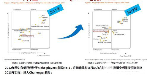 以上數(shù)據(jù)是華為2013年第一季度的表現(xiàn)總結(jié)。數(shù)據(jù)中可以看出不管是發(fā)貨套數(shù)、裝機(jī)容量還是銷(xiāo)售收入華為都創(chuàng)造了非常好的成績(jī)。值得注意的是在全球范圍內(nèi)華為的發(fā)貨套數(shù)和銷(xiāo)售收入分別做到了第八和第九的成績(jī)。2012年華為存儲(chǔ)已經(jīng)處在Gartner魔力四象限中niche players的No.1的位置。經(jīng)寧表示華為希望通過(guò)2013年的努力將華為存儲(chǔ)推向挑戰(zhàn)者象限。屆時(shí)華為存儲(chǔ)是第一家進(jìn)入Gartner挑戰(zhàn)者象限的國(guó)產(chǎn)廠商。
