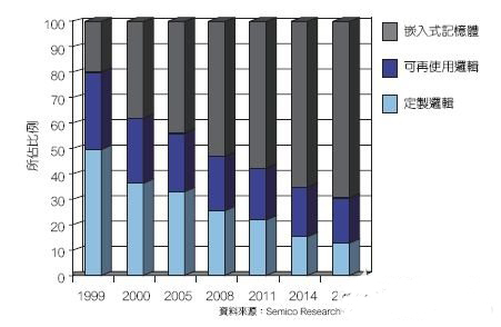 在傳統(tǒng)的大規(guī)模ASIC和SoC設(shè)計中,晶片的實體空間大致可分為用于新的定制邏輯、用于可再使用邏輯(第三方IP或傳統(tǒng)的內(nèi)部IP)以及用于嵌入式存儲器三部份。