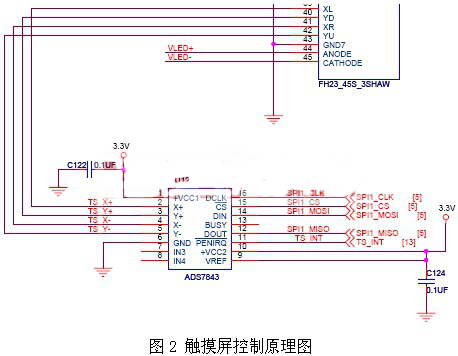 本文中手持式計算機采用四線電阻式觸摸屏,觸摸屏控制器采用ADS7843E,觸摸屏校準(zhǔn)庫tslib采用五點校準(zhǔn)。觸摸屏控制原理如圖2所示。