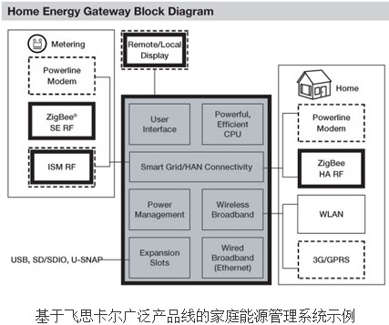一個(gè)i.MX處理器的例子是,在家庭能源管理系統(tǒng)中,通常需要提供綜合用戶界面和廣泛連接功能。飛思卡爾具有多種基于業(yè)界領(lǐng)先Power Architecture和ARM處理器的解決方案,非常適用于這種應(yīng)用,系統(tǒng)方案示例見(jiàn)下圖。其中灰色部分為MPU(微處理器)的框圖,采用了飛思卡爾通信處理器、電源管理器件、無(wú)線收發(fā)器、圖形處理器等廣泛的產(chǎn)品線,如MPC8308、MC13224、S08QE、I.MX233、I.MX6S等,飛思卡爾的解決方案使智能家居中的各個(gè)點(diǎn)都可以通過(guò)一個(gè)集中的點(diǎn)連接和控制,實(shí)現(xiàn)高能效和能源優(yōu)化。