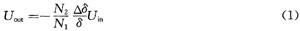 式中:Uin為勵磁電源電壓(單位V);Uout為輸出電壓(單位V);N1,N2分別為勵磁線圈和輸出線圈的匝數(shù);△δ為軸偏移平衡位置的距離(單位mm);δ占為軸處于平衡位置時的氣隙大小(單位mm)。