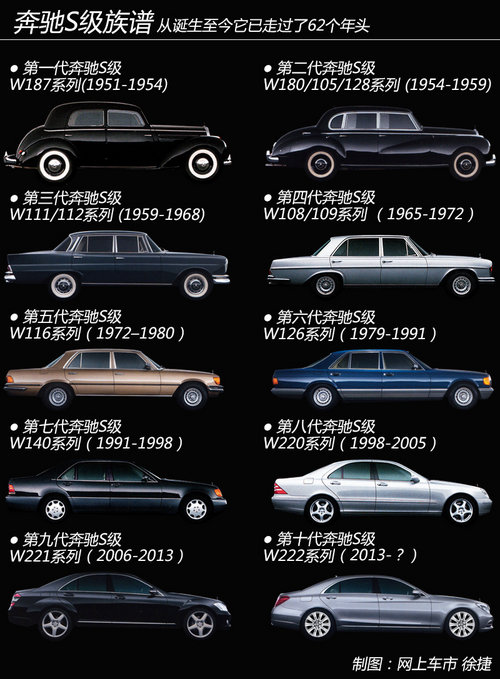 奔馳S級在1951年第一代車型發(fā)布后,一直都是豪華車的標(biāo)桿,此次發(fā)布的奔馳新S級為該車系的第10代車型。新一代S級轎車是奔馳品牌的代表、身份的象征和傳奇的延續(xù),詮釋著奔馳對于豪華轎車的理解,同時也代表了奔馳目前最先進的科技成果。