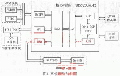 本文就將以DSP控制模塊為核心,由圖像采集模塊、存儲模塊、圖像顯示模塊以及電源管理模塊等模塊構成,系統(tǒng)的硬件結構如圖1所示。