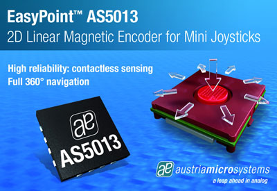 奧地利微電子公司推出非接觸式磁性編碼器IC AS5013,可監(jiān)測一個(gè)內(nèi)嵌于旋鈕中的磁鐵相對(duì)芯片中心位置的位移,并通過一個(gè)I 2 C接口提供位置的X、Y坐標(biāo)信息。AS5013霍爾傳感器IC用于EasyPoint模塊,該模塊由導(dǎo)航旋鈕組件、磁鐵和磁性編碼器IC AS5013構(gòu)成。其簡單的結(jié)構(gòu)和非接觸式傳感技術(shù)使模塊具有極高的可靠性,適合任何基于360°導(dǎo)航輸入的設(shè)備。