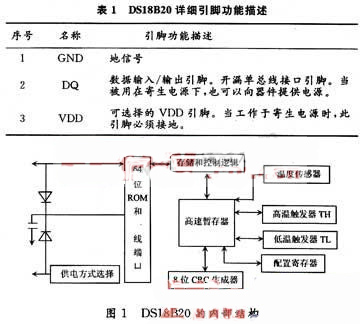 DS18B20的內(nèi)部結(jié)構(gòu)如圖1所示,他主要包括溫度傳感器、64位激光ROM單線單口、存放中間數(shù)據(jù)的高速暫存器、用于存儲用戶設(shè)定的溫度上下限值、觸發(fā)器存儲與控制邏輯、8位循環(huán)冗余校驗(yàn)碼發(fā)生器等。