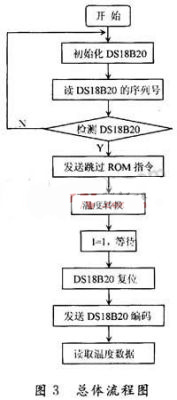 基于DS18B20數(shù)字溫度傳感器的軟件設(shè)計采用C51編寫程序,主要完成DS18B20的測量溫度值計算及溫度值的顯示功能。其采用模塊化設(shè)計,程序設(shè)計包括系統(tǒng)初始化、復(fù)位程序、讀取溫度程序、溫度轉(zhuǎn)換程序、數(shù)碼管顯示程序和延時程序,其總體流程圖如圖3所示。