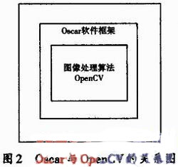 相機(jī)的軟件程序設(shè)計(jì)使用了一個(gè)Oscar(Open source camera)框架平臺(tái)和OpenCV視覺庫(kù),從而使軟件設(shè)計(jì)更加的簡(jiǎn)單、方便、快捷,圖2為Oscar框架與OpenCV的關(guān)系圖。Oscar為軟件的設(shè)計(jì)提供了簡(jiǎn)易的應(yīng)用方法模塊,并且隱藏了硬件接口的復(fù)雜性,從而使軟件設(shè)計(jì)者不需要關(guān)心底層硬件程序的設(shè)計(jì)。而OpenCV構(gòu)建了一個(gè)簡(jiǎn)單易用的計(jì)算機(jī)視覺框架,幫助并發(fā)人員更便捷地設(shè)計(jì)更復(fù)雜的計(jì)算機(jī)視覺相關(guān)的應(yīng)用程序。