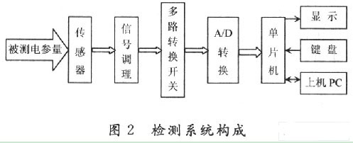 檢測系統(tǒng)構(gòu)成如圖2,被測量經(jīng)霍爾傳感器轉(zhuǎn)換為電壓信號,經(jīng)信號調(diào)理電路和多路轉(zhuǎn)換開關(guān)選擇,通過A/D轉(zhuǎn)換器送給單片機(jī),單片機(jī)采用89C51,是該系統(tǒng)的主控器,鍵盤選用2×4鍵盤,用于選擇被測量的種類,采用數(shù)碼管或液晶顯示被測量的大小。
