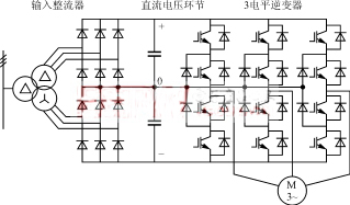 如圖2所示,該系統(tǒng)主電路變頻傳動變壓器為三繞組,二次為12相二極管整流輸出,可減少整流裝置產(chǎn)生的高次諧波對電網(wǎng)的影響,逆變部分為采用高壓IGBT的三電平逆變器。對于HV—IGBT器件,每次開通或關(guān)斷時的瞬變電流和瞬變電壓是可以完全控制的,因而它們可以獲得優(yōu)良的輸出電壓特性,同時,其觸發(fā)電路所需要的元器件數(shù)量比GTO或IGCT的觸發(fā)電路要少得多,故其結(jié)構(gòu)簡單緊湊,而且可靠性極高。