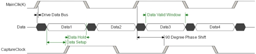 在同步存儲(chǔ)器系統(tǒng)例如QDR SRAM中,數(shù)據(jù)是與時(shí)鐘同步的,所以存儲(chǔ)器數(shù)據(jù)要使相位必須旋轉(zhuǎn)90度。這種相位旋轉(zhuǎn)通常在有效數(shù)據(jù)窗口中進(jìn)行中心調(diào)整時(shí)鐘,是一個(gè)重要的QDR準(zhǔn)確數(shù)據(jù)采集的設(shè)計(jì)特點(diǎn)(見下文圖2)。如果要改變時(shí)鐘中心,我們可以通過對(duì)板上FPGA的PLL網(wǎng)絡(luò)進(jìn)行簡(jiǎn)單的延時(shí)時(shí)鐘信號(hào)來達(dá)到。