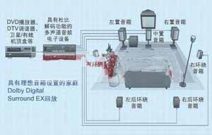 下面介紹一種典型的家庭影院環(huán)境,該環(huán)境擁有可在解壓縮及放大至適當音量后再現(xiàn)多聲道音響效果的典型揚聲器配置。在此特定情況下,解壓縮技術(shù)采用可提供8個聲道音頻內(nèi)容(7個聲道全帶寬音頻和承載超低頻的第八聲道)的Dolby Digital EX。為保持針對影院創(chuàng)造的攝影棚的設(shè)置,相對于視頻內(nèi)容將聲道提前或滯后,以確保聲音抵達聽眾位置后能與銀幕上的畫面同步。須注意的是,相對于公共影院而言,家庭影院環(huán)境中的揚聲器數(shù)量要少得多。如果想要保持多維攝影棚的音效,則這種局限將使揚聲器的布置變得極為關(guān)鍵。