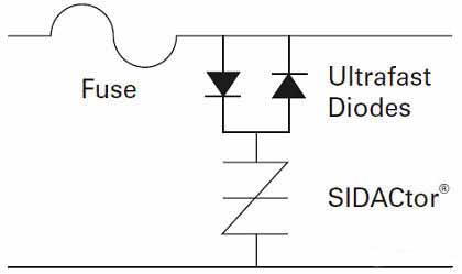 如果使用ADSL線路,可采用單個(gè)GDT或SIDACtor提供保護(hù),在需要電源故障保護(hù)的情況下,還應(yīng)配備一個(gè)熔斷器。在此類應(yīng)用中,最好采用微電容SIDACtor以減少信號(hào)失真。如果電容值太高,可安裝反并聯(lián)連接的一對(duì)離散超快開關(guān)二極管(圖1),將總電容降低至15pF,也可以采用內(nèi)置上述二極管的SDP或SEP SIDACTOR系列。