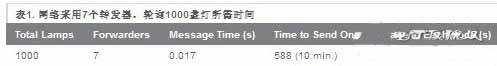 由于距離或變壓器產(chǎn)生的PLC信號(hào)衰減,集中器不能直接與每個(gè)節(jié)點(diǎn)進(jìn)行通信。這種情況下,采用G3-PLC網(wǎng)狀架構(gòu),使每個(gè)節(jié)點(diǎn)成為轉(zhuǎn)發(fā)器,轉(zhuǎn)發(fā)集中器與每個(gè)節(jié)點(diǎn)之間的消息。本例采用了7個(gè)轉(zhuǎn)發(fā)器(表1),平均轉(zhuǎn)發(fā)延遲時(shí)間0.005s,采用單個(gè)集中器,集中器輪詢所有節(jié)點(diǎn),集中器將一條消息發(fā)送至每盞燈的總時(shí)間為10分鐘。這一時(shí)間間隔允許經(jīng)營(yíng)者根據(jù)每盞燈的位置(例如:山坡上、地下通道內(nèi)或低谷)點(diǎn)亮路燈或更改光度。即使必須控制全部路燈,最大延遲也只有10分鐘。如果需要將相同命令發(fā)送給所有路燈,例如緊急“打開”命令,可使用廣播命令,到達(dá)所有路燈的時(shí)間短于2s。