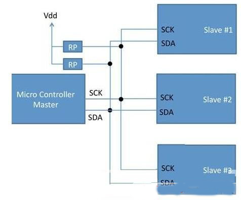 從物理學(xué)和電氣學(xué)的角度來看,SPI和I2C都是低開銷的總線標(biāo)準(zhǔn),一般從電路板實(shí)現(xiàn)的角度來看就很容易理解。I2C只需要兩個(gè)信號來實(shí)現(xiàn):SDA(數(shù)據(jù)線)和SCK(時(shí)鐘線)。這些線路都是漏極開路,并要求端接上拉電阻。這些連線可以跨越多個(gè)主器件和從器件,如圖1所示。該電路還需要的唯一一個(gè)額外要求就是使用適當(dāng)?shù)亩私由侠娮鑱硖幚砭€路電容。兩線總線上的多個(gè)主器件的問題需要使用總線仲裁來處理消息沖突。但是使用一個(gè)簡單的專用總線結(jié)構(gòu)和一個(gè)主器件,這些問題就可以全部解決。