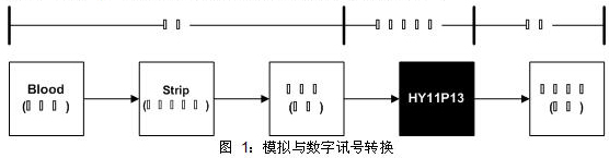 利用測(cè)試試紙做為葡萄糖訊號(hào)的擷取來(lái)源,以固定偏壓方式激發(fā)試紙與血液的電化學(xué)反應(yīng)成為電流訊號(hào)輸出,再經(jīng)由纮康科技的單片機(jī)“HY11P13 ” 量測(cè)電流訊號(hào)、運(yùn)算、數(shù)字輸出顯示,如圖 1,以最少的組件達(dá)成偏壓式電流量測(cè)方案。