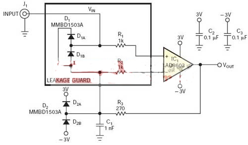 在某些測(cè)量應(yīng)用中,如pH值(酸度)和生物電勢(shì)需要高阻抗緩沖放大器。雖然有幾個(gè)半導(dǎo)體制造商提供具有低偏置和輸入偏置電流特點(diǎn)的放大器芯片,配上傳感器電纜可能會(huì)因?yàn)镋SD(靜電放電)對(duì)放大電路造成損害。圖1顯示一種不令人滿(mǎn)意的方法實(shí)現(xiàn)ESD保護(hù)。電阻R1抑制ESD的放電電流,而二極管D1A 和D1B鉗住放大器IC1的輸入到供電電源軌。不幸的是,當(dāng)并聯(lián)pH值傳感器的為400MΩ輸入阻抗時(shí),即使采用低漏電流二極管,如Fairchild公司的MMBD-1503A,仍引入很大的偏置電壓。