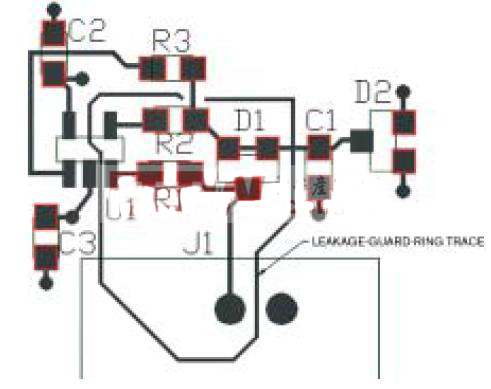 封裝電路時(shí),需要特別注意電路板的布局。電路板介電性能的缺陷會(huì)給寄生漏電流提供路徑。在電路板的兩面敷銅形成保護(hù)環(huán),可以在電路高阻抗節(jié)點(diǎn)周?chē)D(zhuǎn)移漏電流(圖3)。