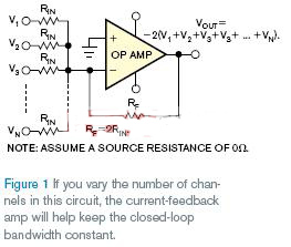 如果使用如圖1電路的電流反饋放大器,放大器閉環(huán)帶寬較少的依靠閉環(huán)增益和輸入通道數(shù)。如果用這樣的放大器設(shè)計電路,首先應(yīng)該挑選合適的反饋電阻,各廠商的規(guī)格和電路噪聲增益。然后選擇合適的RIN值。從這一點,如果電路增加通道,或許將發(fā)生信號帶寬和增益劇增的微小變化。如果那個情形出現(xiàn),退回并確定反饋電阻的選擇。對電流和電壓反饋放大器,噪聲增益通常與公式1的結(jié)果相等,但減少電流反饋放大器電路的反饋電阻值,使電路帶寬增加。