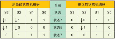 如果狀態(tài)機(jī)采用格雷碼而不是二進(jìn)制碼來設(shè)計(jì),則這兩個(gè)狀態(tài)之間的轉(zhuǎn)換所需的邏輯轉(zhuǎn)換量將降至僅為一位。另外,如果將狀態(tài)7和8分別編碼為0010和0011,亦可達(dá)到同樣的效果。