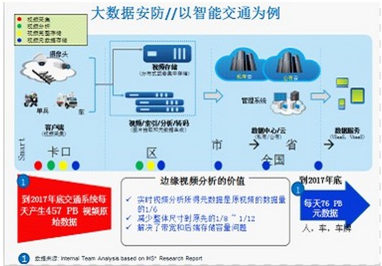 以智能交通為例,無論抓拍的是抽象圖像還是視頻,里面有大量的元素是重復、沒有意義的,抽取出有價值的元素、傳輸?shù)胶笈_,可以大大減少帶寬壓力、網絡以及后臺的開銷。據(jù)IHS預測,到2017年底,交通系統(tǒng)每天產生457PB視頻原始數(shù)據(jù)。如果我們通過實時視頻分析進行數(shù)據(jù)抽取,數(shù)據(jù)量可以降低6成,還能解決帶寬和后端存儲容量問題。更重要的是,除車牌外,這些元素還包括個人的特征,可為之后的智能分析提供元素,甚至一些數(shù)據(jù)的向量。