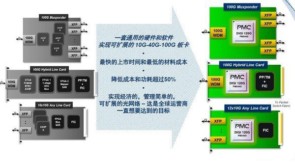 作為業(yè)界首款支持可按需重設大小的ODUflex以及從1G、10G、40G至100G速率的OTN處理器,DIGI 120G支持多種配置,包括十二個10Gbps端口,三個40Gbps端口或單個100Gbps端口,從而使設備制造商只需一套通用的硬件及軟件投資,就可以迅速推出一整套用于分組光傳送平臺(P-OTP)的多業(yè)務OTN交換卡以及用于ROADM的Muxponder。此外,該芯片還完全支持ITU-T G.hao標準,并集成了PMC自主研發(fā)的Swizzle增強型FEC,據稱可實現9.45db的業(yè)界最高增益。
