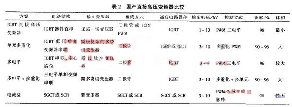 從機(jī)泵工作特性曲線可得出其流量與轉(zhuǎn)速成正比、軸功率與轉(zhuǎn)速的3次方成正比,即 .根據(jù)這一原理采用變頻調(diào)速技術(shù).對(duì)目前各種高壓變頻器進(jìn)行分析后認(rèn)為:高一低一高的變頻器雖然可靠性較高,但需配置輸入、輸出變壓器,必須增設(shè)廠房,施工周期長(zhǎng),設(shè)備較龐大、投資費(fèi)用較高,而且效率較低、諧波含量大,嚴(yán)重影響電機(jī)使用壽命.擬應(yīng)用直接高壓變頻器,但進(jìn)口設(shè)備費(fèi)用較高,而且設(shè)備體積也不小,不是首選,故目光投向國(guó)產(chǎn).國(guó)產(chǎn)直接高壓變頻器比較見(jiàn)表2.
