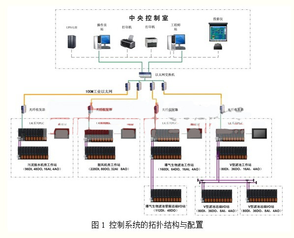 海興縣污水廠控制系統(tǒng)的拓撲結(jié)構(gòu)與功能配置如圖1 所示: