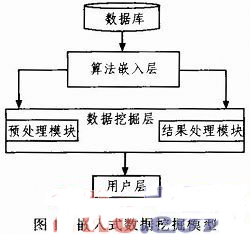嵌入式數(shù)據(jù)挖掘模型主要是采用多種數(shù)據(jù)庫訪問技術(shù)把算法嵌入到數(shù)據(jù)挖掘系統(tǒng)中。該模型支持按照一定的標準規(guī)范來開發(fā)挖掘算法,并把算法發(fā)布嵌入到多種數(shù)據(jù)庫、數(shù)據(jù)倉庫當中,將數(shù)據(jù)挖掘過程完全控制在數(shù)據(jù)庫、數(shù)據(jù)倉庫系統(tǒng)中,將數(shù)據(jù)挖掘功能轉(zhuǎn)換成大家熟悉的、通用的、靈活的、可二次開發(fā)的數(shù)據(jù)倉庫功能。