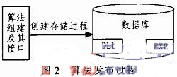 算法發(fā)布過程首先就是把算法封裝成DLL文件,同時把調(diào)用算法的接口編譯成EXE文件,然后把算法DLL文件和相應(yīng)的EXE文件發(fā)布到數(shù)據(jù)庫或數(shù)據(jù)倉庫中,最后在相應(yīng)的數(shù)據(jù)庫中創(chuàng)建存儲過程(簡稱SP),流程如圖2所示。