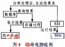 結(jié)果處理流程其實和算法凋用過程是同時進行的,在EXE文件中通過數(shù)據(jù)庫訪問技術(shù)獲取數(shù)據(jù),在EXE中調(diào)用DLL算法產(chǎn)生文本結(jié)果返回到EXE文件中。這時候,這個文本結(jié)果可以經(jīng)過加工處理寫回數(shù)據(jù)倉庫,同時也可以展示給用戶。具體如圖4所示。分析處理后,生成結(jié)果表查詢結(jié)果。
