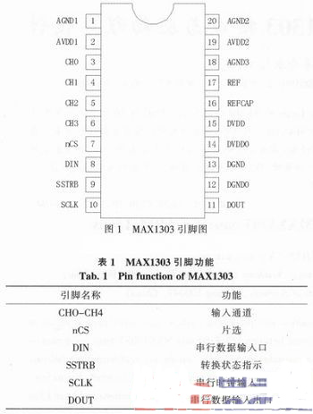 MAX1303是MAXIM公司推出的工業(yè)級、低功耗、多量程、16位精度的模/數(shù)轉(zhuǎn)換芯片,采用+5 V單電源供電,最高采樣率可達(dá)115kbps??墒褂?4.096 V片上基準(zhǔn)或者3.800到4.136 V之間的外部電壓基準(zhǔn)。采用20引腳的TSOP封裝。它的引腳如圖1所示。