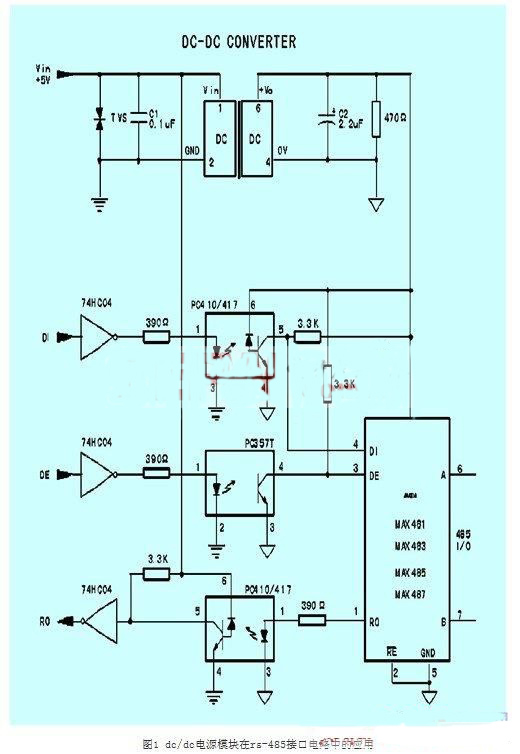 dc/dc電源模塊在rs-485接口電路的應(yīng)用(dc/dc電源模塊:隔離電壓1000vdc,in:5v,out:5v,p:1w),其電路如圖1所示。