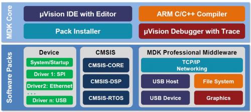 MDK Core包含微控制器開(kāi)發(fā)所有的所有組件,包括IDE(uVision5)、編輯器、ARM C/C++編輯器、uVision調(diào)試跟蹤器和Pack Installer。