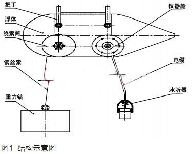 本裝置采用雙體流線型玻璃鋼結(jié)構(gòu),中間裝配繞索筒和電路儀器艙,具有外形小,重量輕,浮力大,布放方便的特點(diǎn)。結(jié)構(gòu)示意圖如圖1所示。