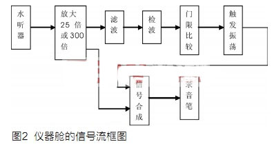 電路儀器艙用來實(shí)現(xiàn)對(duì)換能器信號(hào)的處理,最終將收取到的爆炸信號(hào)記錄到錄音筆中。電路儀器艙由放大電路、頻率變換合成電路、錄音筆,供電裝置組成。儀器艙的信號(hào)流框圖見圖2。