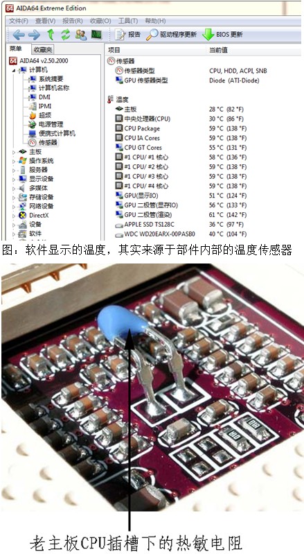 要想在最新的筆記本中看一看溫度傳感器長什么樣,那可不是件容易的事情,畢竟,外置的電阻無法直接探測(cè)部件內(nèi)部溫度,再加上容易出現(xiàn)接觸不良的問題。因此,只有在老主板的CPU插槽下“一睹芳容”。如今筆記本的溫度傳感器早已置身于各部件芯片中,如處理器、顯卡芯片、硬盤內(nèi)部,通過軟件顯示實(shí)際溫度。
