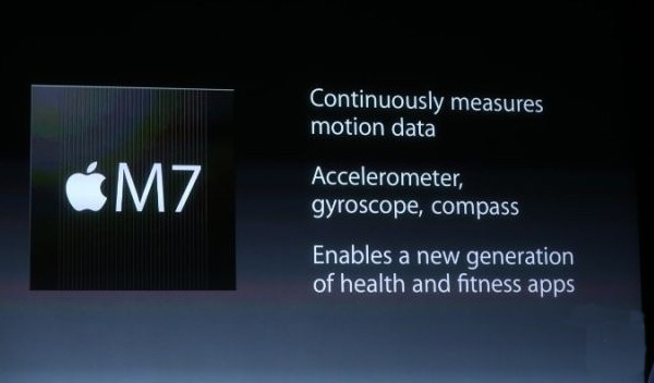 M7 協(xié)處理器,蘋果稱之為減輕 iPhone 5S 工作量并提高能效的芯片。該芯片可以從加速感應(yīng)器、陀螺儀和指南針收集運(yùn)動數(shù)據(jù),達(dá)到減輕 A7 芯片成噸負(fù)擔(dān)的效果,延長 iPhone 5S 的續(xù)航時(shí)間。換句話說,一大堆類似健身或者運(yùn)動跟蹤數(shù)據(jù)的應(yīng)用程序可以直接調(diào)用 M7 系處理器,而無需 A7 芯片參與工作,大大降低整機(jī)的耗電量。