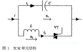 TCSC的基本結(jié)構(gòu)是固定的串補電容C并聯(lián)一個由雙向晶閘管(實際也可把兩個單向晶閘管并聯(lián)反接在一起)控制的電抗L ,圖1所示為穩(wěn)態(tài)分析用的TCSC模型: