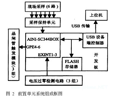 前置單元硬件電路的核心部分采用51EDA和勤研公司聯(lián)合研制的44B0X開發(fā)板。 該開發(fā)板使用SAMSUMG S3C44B0X處理器,并集成了其它外部設(shè)備,主要包括2 MB16 位數(shù)據(jù)寬度的線性Flash( SST39VF160) , 10M TCP / IP 接口(RTL8019 ) , USBDevice接口( Philip s PD IUSBD12) ,LCD接口, 7路ADC輸入,兩路標準RS232接口等等。此外,根據(jù)課題需要在設(shè)計中還自行擴展了過零檢測電路,采樣保持電路和可控硅觸發(fā)電路。