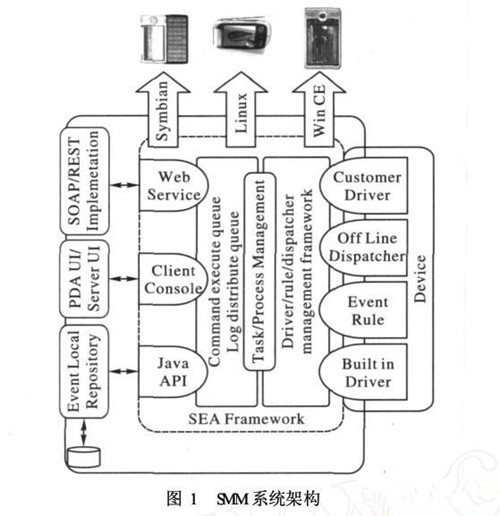 SMM的系統(tǒng)整體架構(gòu)包括三大模塊,其中:最下層為Device模塊,負(fù)責(zé)把物理的真實設(shè)備抽象為系統(tǒng)的Device對象;中間層為Task Manager模塊,是SMM的核心模塊,負(fù)責(zé)處理用戶和上層應(yīng)用系統(tǒng)的一切命令,把標(biāo)準(zhǔn)的XML命令轉(zhuǎn)化系統(tǒng)的Task對象并執(zhí)行,以用來控制Device對象;最上層是用戶接口(User Interface,UI)模塊,是基于標(biāo)準(zhǔn)的Java swing開發(fā)的圖形界面,使用戶可以在本地方便地控制Device對象。同時,SMM也提供標(biāo)準(zhǔn)Web service接口,方便其他遠(yuǎn)程系統(tǒng)控制和管理移動設(shè)備。