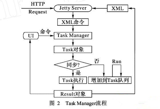 基于Task Manager模塊,SMM提供圖形界面和Web Service兩種類型的請求來控制和管理移動設(shè)備,以使用戶獲取所需的數(shù)據(jù)。如果是SMM內(nèi)部請求,則提供標(biāo)準(zhǔn)的Java API;如果是外部請求,則提供基于XML的標(biāo)準(zhǔn)Web接口。圖3給出了Task Manager的實現(xiàn)流程。在模塊中,上層應(yīng)用程序通過HTTP協(xié)議把標(biāo)準(zhǔn)XML命令發(fā)送到SMM,SMM通過內(nèi)嵌的輕型HTTP Server Jetty處理各種HTTP請求。Jetty接受到標(biāo)準(zhǔn)的XML請求后,把各種XML命令給Task Manager模塊,Task Manager解析XML格式的命令后,通過Java反射得到對應(yīng)的Task對象。如果Task對象是同步的,則調(diào)用Task執(zhí)行方法,返回相應(yīng)結(jié)果并轉(zhuǎn)化成標(biāo)準(zhǔn)XML給Jetty服務(wù)器;如果Task對象是異步的,則放到任務(wù)隊列里面去,返回為空。