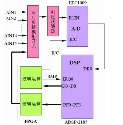 硬件系統(tǒng)的示意圖如圖1所示。外部輸入的電壓電流經(jīng)過(guò)電壓互感器或電流互感器,經(jīng)過(guò)信號(hào)調(diào)理,變換成小電壓信號(hào),把這些小電壓信號(hào)經(jīng)過(guò)濾波、放大處理之后送入模擬多路開(kāi)關(guān)。接入多路開(kāi)關(guān)的信號(hào)AIN1、AIN2、…AIN15的切換由DSP通過(guò)FPGA來(lái)控制。多路開(kāi)關(guān)的輸出接電壓跟隨器,以降低信號(hào)源的輸出阻抗,保證得到較高的采集精度。經(jīng)A/D轉(zhuǎn)換完成后的數(shù)據(jù)由DSP芯片進(jìn)行采集處理。
