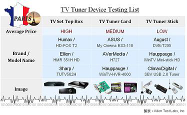 在測(cè)試概念上,我們首先研究過(guò)歐、美、亞洲等各大消費(fèi)電子市場(chǎng),發(fā)現(xiàn)到以機(jī)頂盒(TV Set Top Box)、電視卡(TV Tuner Card)以及電視棒(TV Tuner Stick)占信號(hào)接受器產(chǎn)品的最大份額,因此我們選擇這三個(gè)類(lèi)型的產(chǎn)品為范本,并從每個(gè)類(lèi)型中各挑選出三家知名廠牌的產(chǎn)品作為測(cè)試對(duì)象。這些所有產(chǎn)品都將與自今年五月份從巴黎實(shí)地錄制回來(lái)的42臺(tái)無(wú)線電視信號(hào)(包含模擬與數(shù)字頻道),通過(guò)射頻播放儀器進(jìn)行實(shí)際的播放測(cè)試,并通過(guò)相關(guān)的功能指標(biāo)來(lái)檢視產(chǎn)品在各個(gè)方面的表現(xiàn)。在下面的文章中,我們將先介紹檢視產(chǎn)品品質(zhì)的四大功能指標(biāo),另外由于這三種類(lèi)型產(chǎn)品在設(shè)計(jì)架構(gòu)及功能訴求上皆有所不同,我們也將在第二部份整理出它們?cè)跍y(cè)試過(guò)程中所發(fā)現(xiàn)的實(shí)際問(wèn)題。